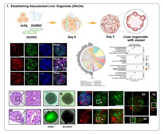 肝脏作为人体的核心代谢器官,其功能的正常运转依赖于内部精密的多脉管网络结构。然而,现有肝脏类器官大多缺乏功能性血管和胆管结构,难以真实模拟人体肝脏的生理与病理过程,这严重制约了其在基础研究与转化医学中的应用。为突破该瓶颈,葛广波与郭兆彬研究团队创新性地将重编程人肝样细胞、人脐静脉内皮细胞和人脐带间充质干细胞在三维系统中共同培育。经过系统优化,上述三种细胞成功自组装形成了具有CD31⁺血管网络和CK19⁺胆管样结构的肝脏类器官。相较于传统肝细胞类器官,该新型类器官不仅展现出更优异的白蛋白合成、糖原储存、药物转运与代谢等肝脏核心功能,其血管网络还能与体外芯片模型或宿主体内血管系统有效连接,实现功能性血液灌注。