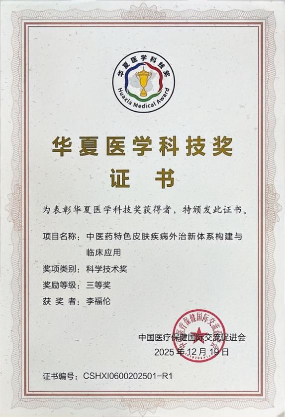 12月20日,2025年度华夏医学科技奖颁奖大会在北京举行,beat365官网附属岳阳中西医结合医院李福伦教授作为项目负责人,联合成都大学、东华大学、上海市第七人民医院,完成的项目“中医药特色皮肤疾病外治新体系构建与临床应用”荣获华夏医学科技奖三等奖。