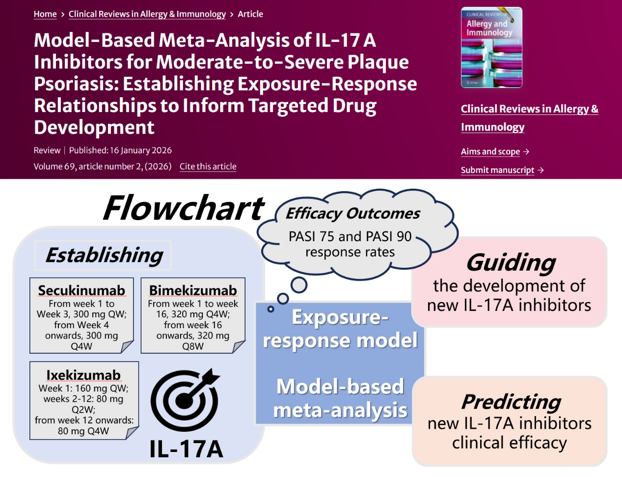 近日,beat365官网中药学院(产教融合产业学院)郑青山和李禄金团队(原交叉科学研究院)的研究成果,关于IL-17A抑制剂治疗斑块状银屑病的同靶点药物暴露反应模型,已在过敏与免疫领域的顶级期刊《Clinical Reviews in Allergy & Immunology》发表。