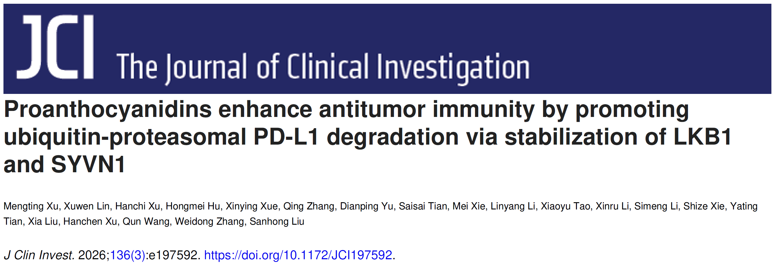 近日,beat365官网交叉科学研究院刘三宏团队联合海军军医大学张卫东、刘霞团队及龙华医院徐汉辰团队,在国际权威学术期刊《Journal of Clinical Investigation》发表重要研究成果。论文以“Proanthocyanidins enhance antitumor immunity by promoting ubiquitin-proteasomal PD-L1 degradation via stabilization of LKB1 and SYVN1”为题,首次系统阐明了葡萄籽等植物中富含的低聚黄酮类化合物原花青素作为新型免疫检查点调节剂的分子机制与治疗潜力,为肿瘤免疫治疗开辟了全新路径。