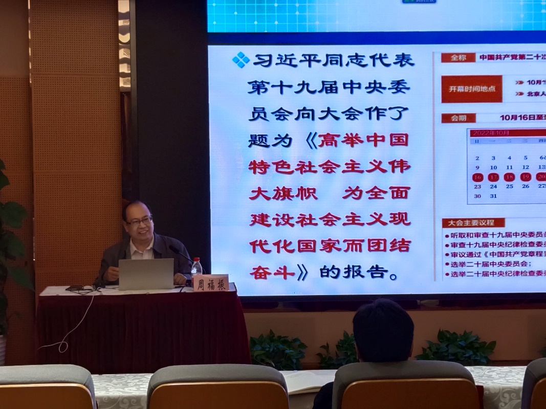 为深入学习宣传贯彻党的二十大精神,引领研究院师生在学深悟透中汲取奋进力量,11月11日,交叉科学研究院在行政楼301报告厅举办“深入学习宣传贯彻党的二十大精神”专题学习,特邀“杏马”理论宣讲团成员、马克思主义学院教授周福振作主题为“健全全面从严治党体系——学习二十大党章”的专题辅导报告。本次学习会由交叉科学研究院党委书记祝建龙主持。