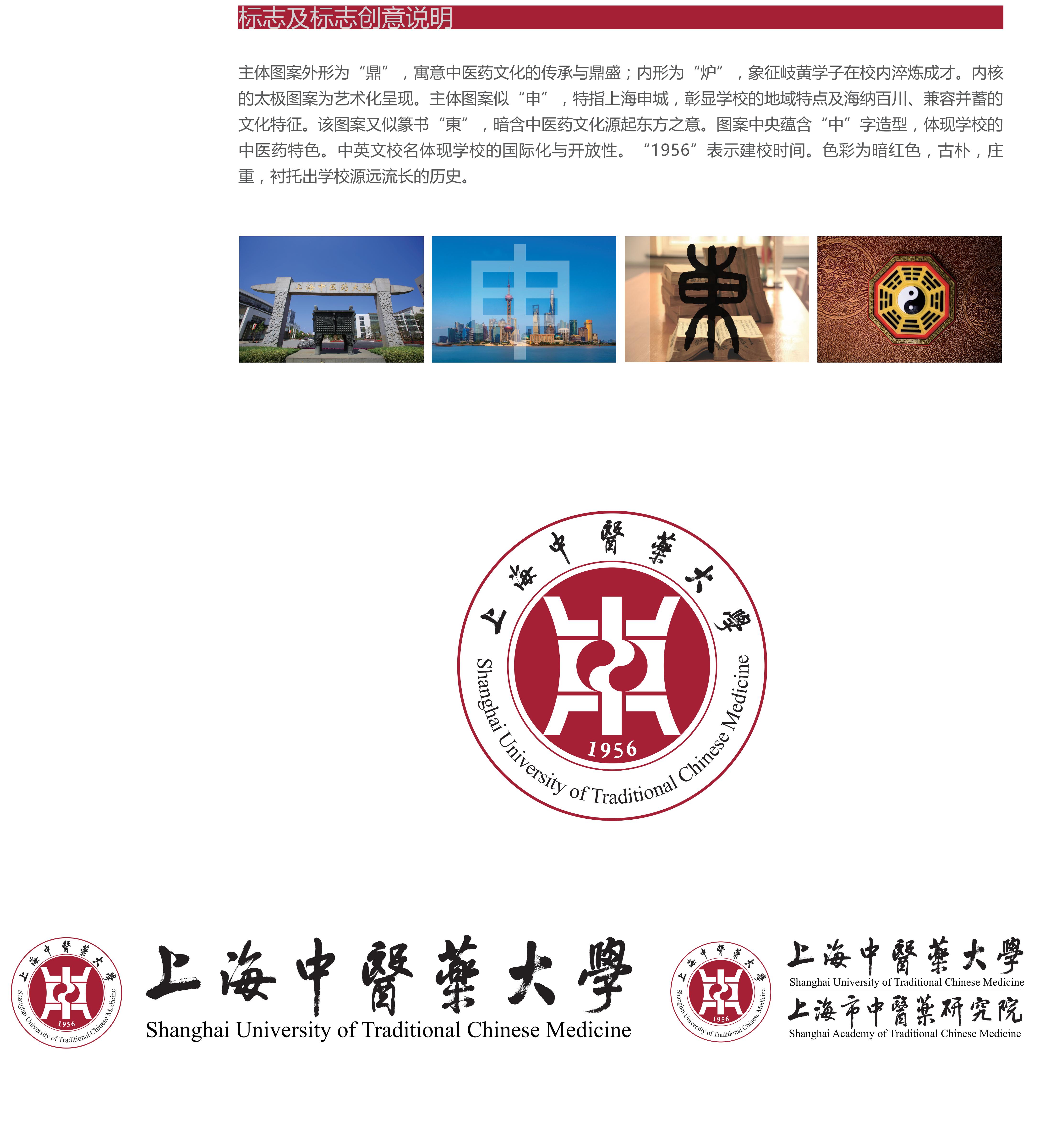beat365官方网站校标主体图案外形为“鼎”,寓意中医药文化的传承与鼎盛;内形为“炉”,象征岐黄学子在校内淬炼成才。内核的太极图案为艺术化呈现。主体图案似“申”,特指上海申城,彰显学校的地域特点及海纳百川、兼容并蓄的文化特征。该图案又似篆书“東”,暗含中医药文化源起东方之意。图案中央蕴含“中”字造型,体现学校的中医药特色。中英文校名体现学校的国际化与开放性。“1956”表示建校时间。色彩为暗红色,古朴,庄重,衬托出学校源远流长的历史。