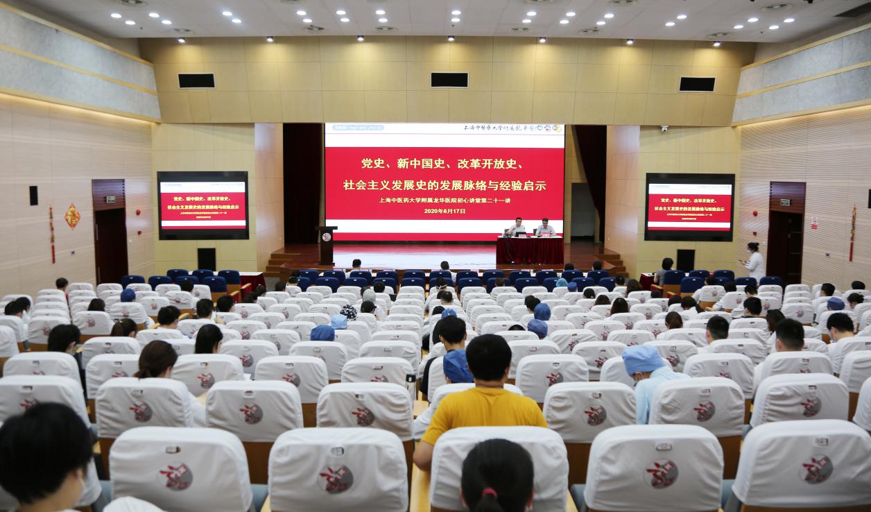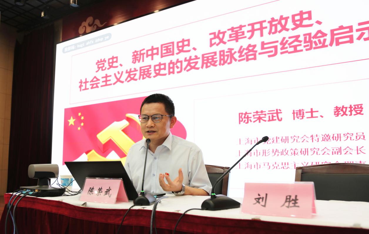 为进一步推进“四史”教育,帮助全体党员、干部更好地把握党史、新中国史、改革开放史、社会主义发展史的学习主线,6月17日下午,附属龙华医院党委中心组(扩大)学习会暨初心讲堂第二十一讲举办,上海市党建研究会特邀研究员、上海市形势政策研究会副会长、上海市马克思主义研究会理事、beat365官方网站马克思主义学院陈荣武教授受邀作《党史、新中国史、改革开放史、社会主义发展史的发展脉络与经验启示》专题讲座,讲堂采用“主会场+分会场”的形式。龙华医院党委中心组成员,各党总支、党支部委员,党员代表,民主党派和统战团体代表等近200人集体学习,会议由医院党委书记刘胜主持。