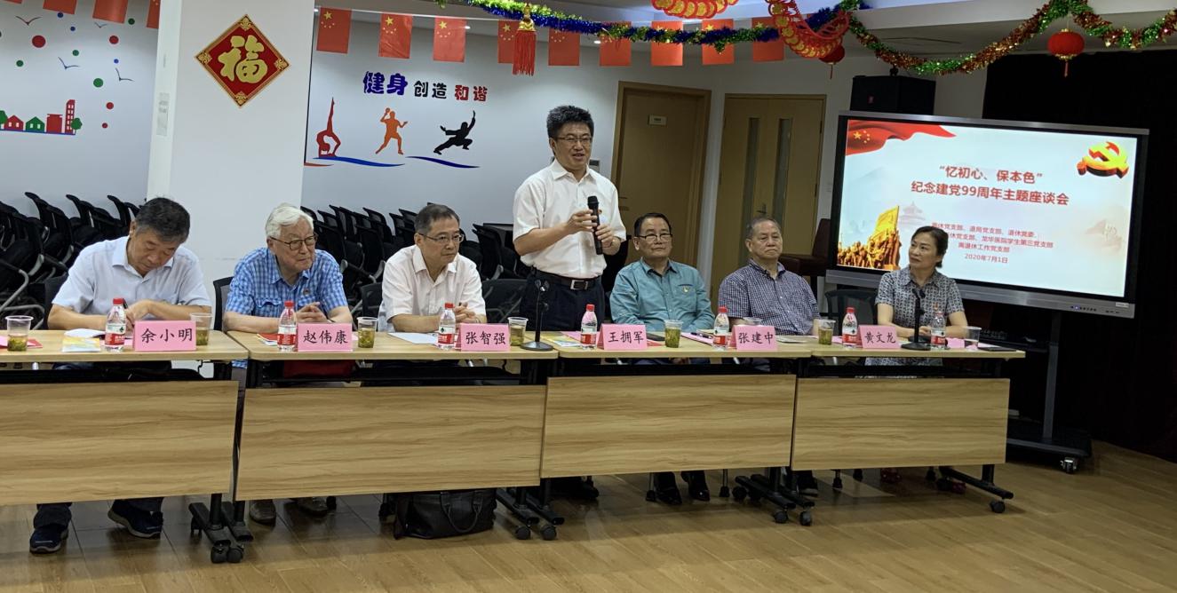 7月1日上午,校离休党支部、退休局级干部党支部、退休党委、附属龙华医院离退休党支部、龙华医院学生第三党支部以及离退休工作党支部联合举办“忆初心、保本色”庆祝建党99周年主题座谈会暨“四史”专题学习会。beat365官网副校长王拥军出席会议,30多位离退休党员与学生座谈交流,会议由离退休工作处处长、离休党支部副书记蔡贞贞主持。