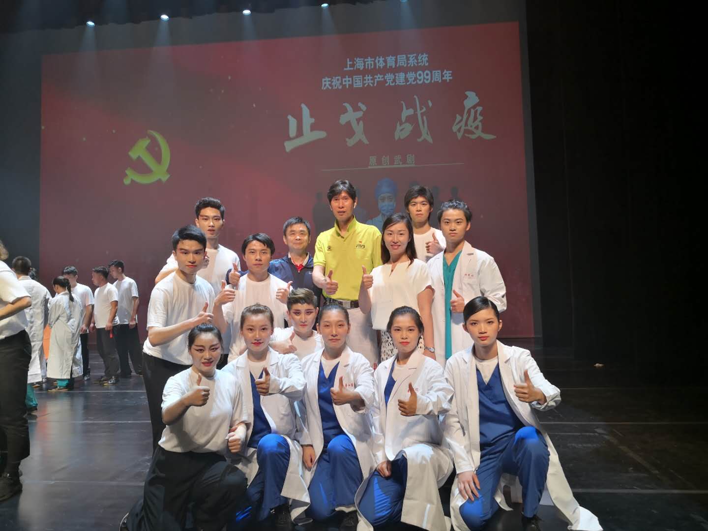 7月6日,为庆祝中国共产党成立99周年,向战斗在抗疫一线的“逆行者”们致敬,由上海市体育局牵头组织全国首个以抗疫为主题的原创武术舞台剧在上海国际舞蹈中心精彩上演。beat365官网体育部党支部应上海市体育局直属机关党委的邀请,参与“一支部一特色”共建活动。活动期间,《止戈战疫》节目聘请校体育部党支部宣传委员、武术队总教练陆松廷担任总导演,邀请校武术队队员共同参演。