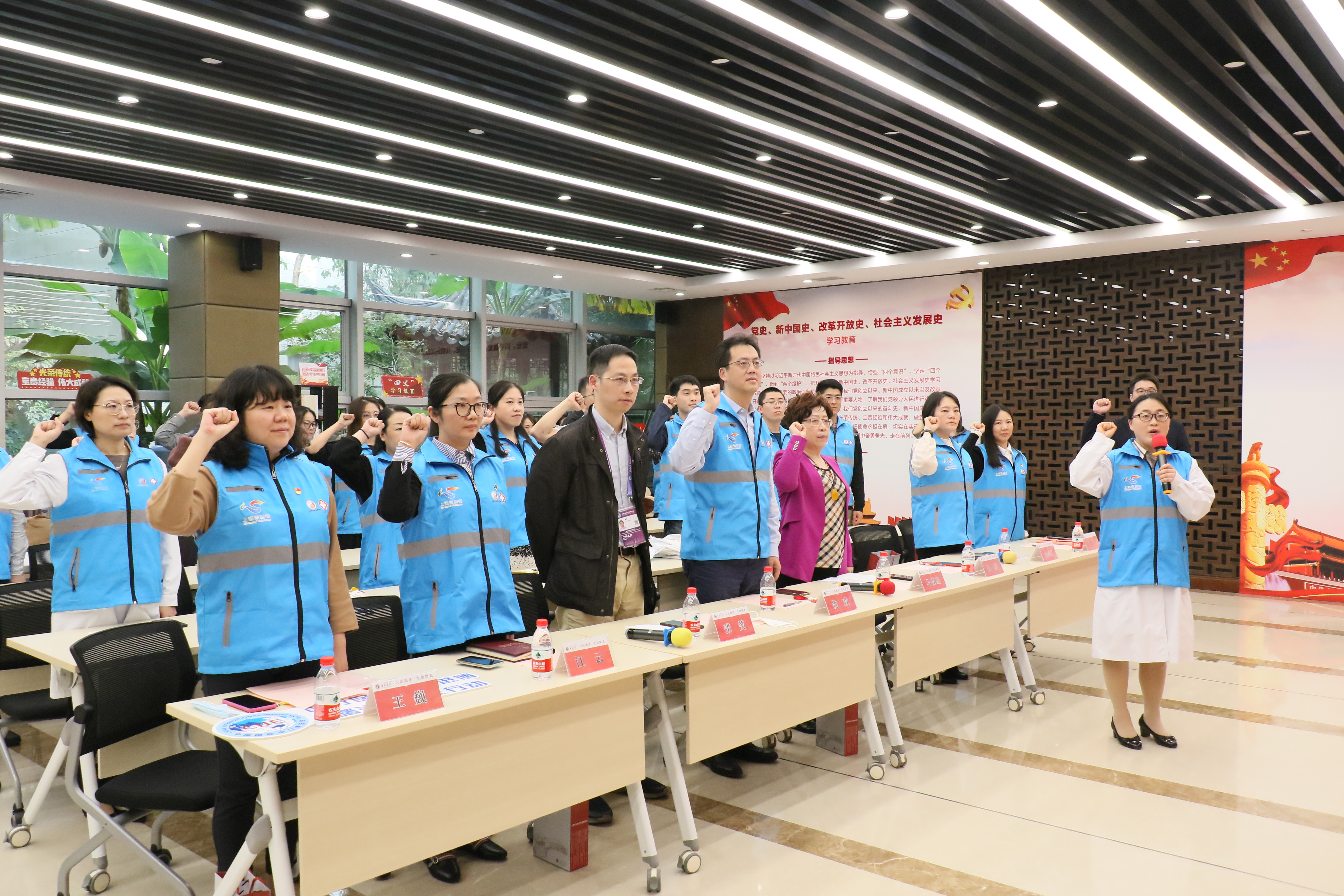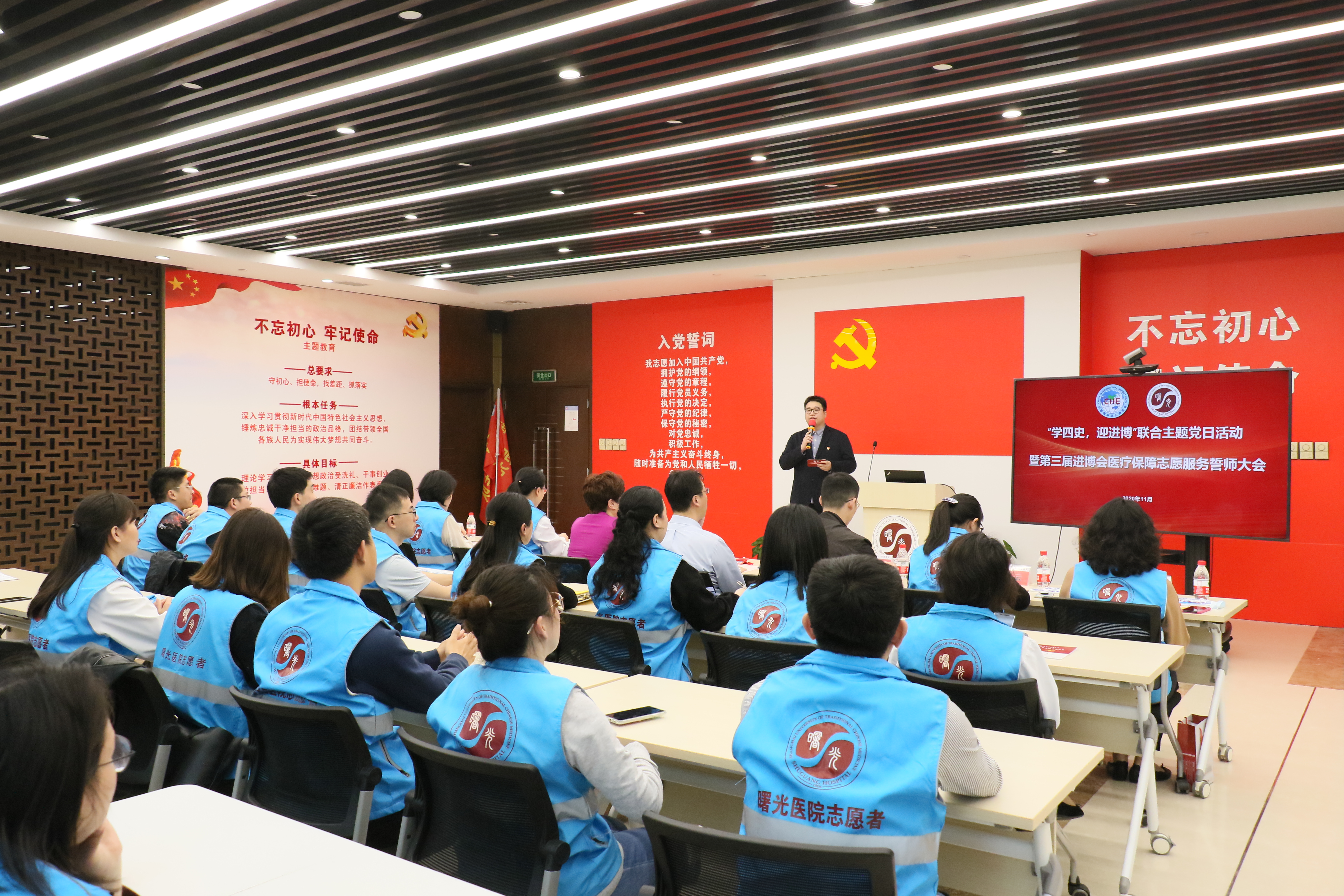 在第三届中国国际进口博览会开幕之际,曙光医院医务志愿者整装待发,组建了党员先锋队和青年突击队两支志愿服务队伍,为进博会的顺利开展提供医疗保障服务。11月2日下午,“学‘四史’,迎进博”联合主题党日活动暨第三届进博会医疗保障志愿服务誓师大会在曙光医院党建活动室举行,曙光医院党委书记马俊坚、党委副书记姚政、副院长仇菲,团市委社会工作部副部长张笑出席,为志愿者上岗做好动员培训工作。