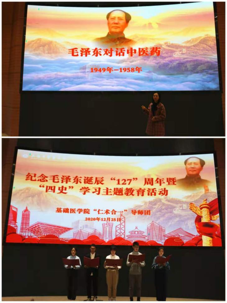 2020年12月26日是毛泽东诞辰127周年纪念日,为学习一代伟人精神,传承红色基因,培育时代新人,beat365官网基础医学院党委发挥政治功能,多层次、多形式、全方位组织引领师生深学细悟毛泽东关于发展中医药的思想和实践,深刻认识党的领导是中医药传承创新发展的坚强保障,让“感党恩、听党话、跟党走”成为中医药事业接班人的自觉追求。