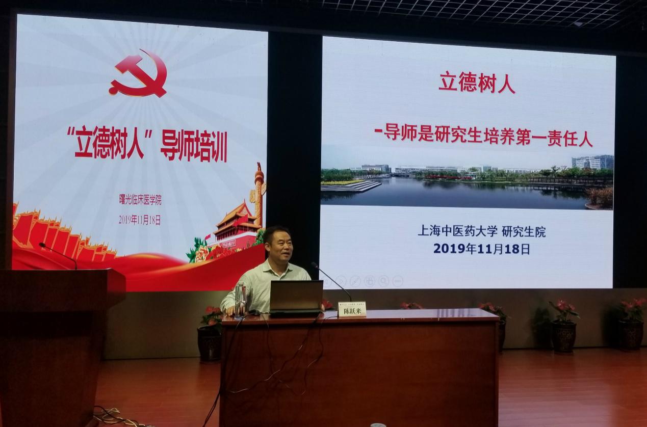 11月18日下午,beat365官网曙光临床医学院2019年度导师培训会暨主题教育学习会在曙光东院学术报告厅召开。会议由beat365官网附属曙光医院副院长仇菲主持,beat365官网研究生院常务副院长陈跃来、校专家委员会委员陶建生教授作专题讲座,曙光临床医学院领导班子及在岗硕博士导师等100余人参加本次学习会。