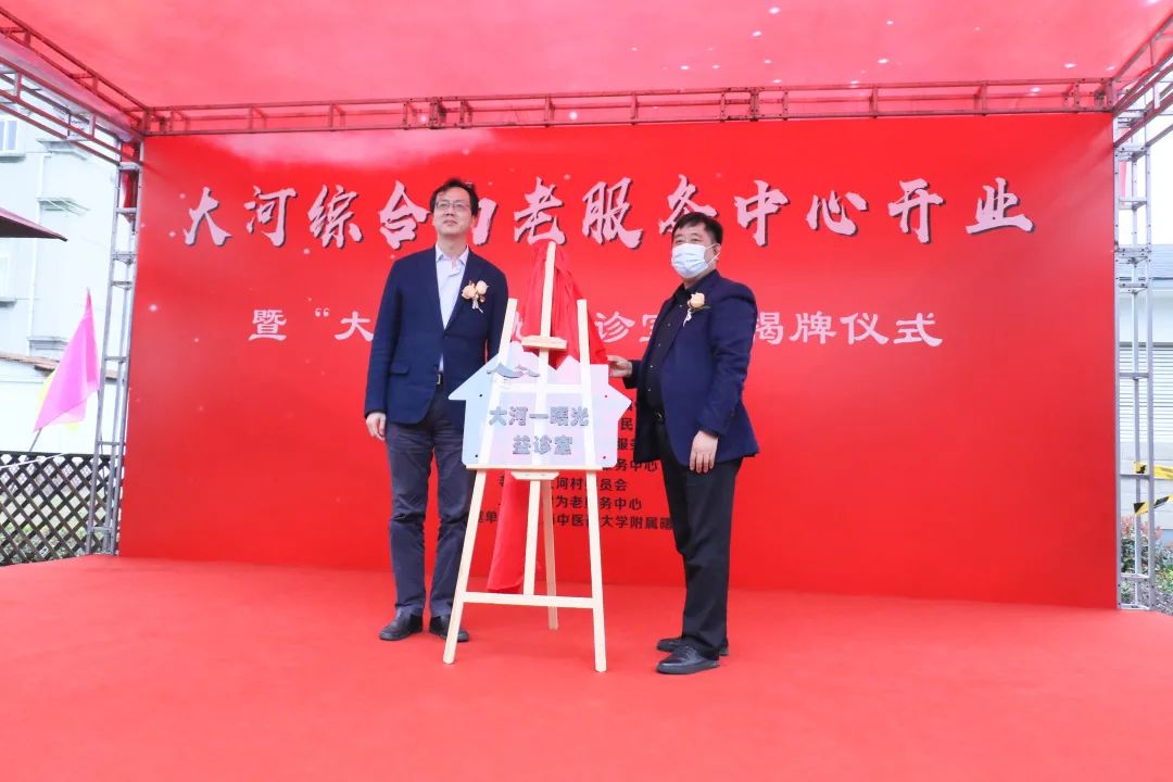 曙光医院党委副书记姚政与老港镇党委副书记张顺龙为“大河——曙光益诊室”揭牌。这块牌子将悬挂于大河综合为老服务中心。“曙光益诊室”成立于2016年,是医院党委与淮海街道党工委进行区域党建共建的特色志愿服务品牌,当时的“淮海+曙光益诊室”开在楼宇里,深受白领们的热捧。