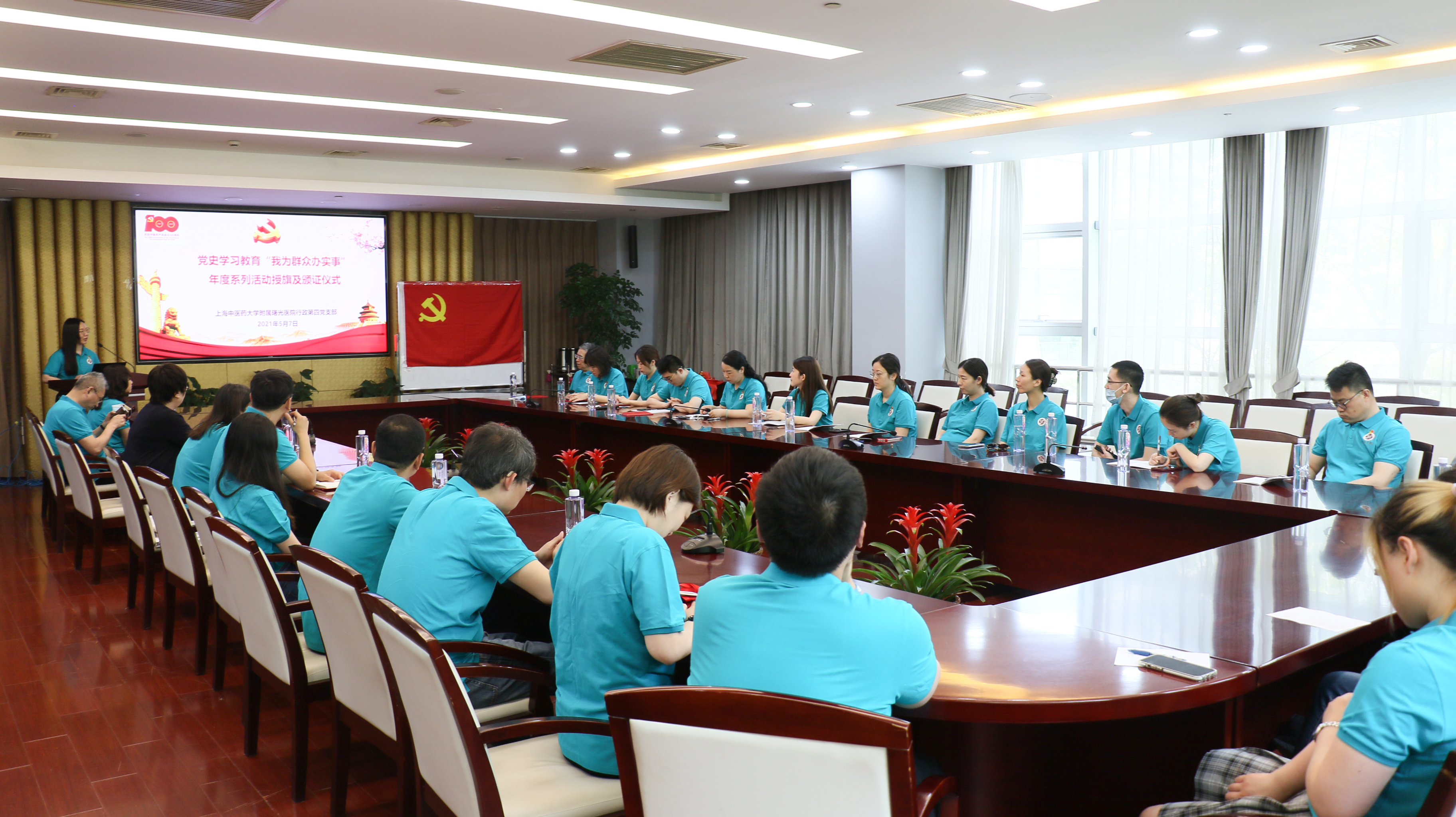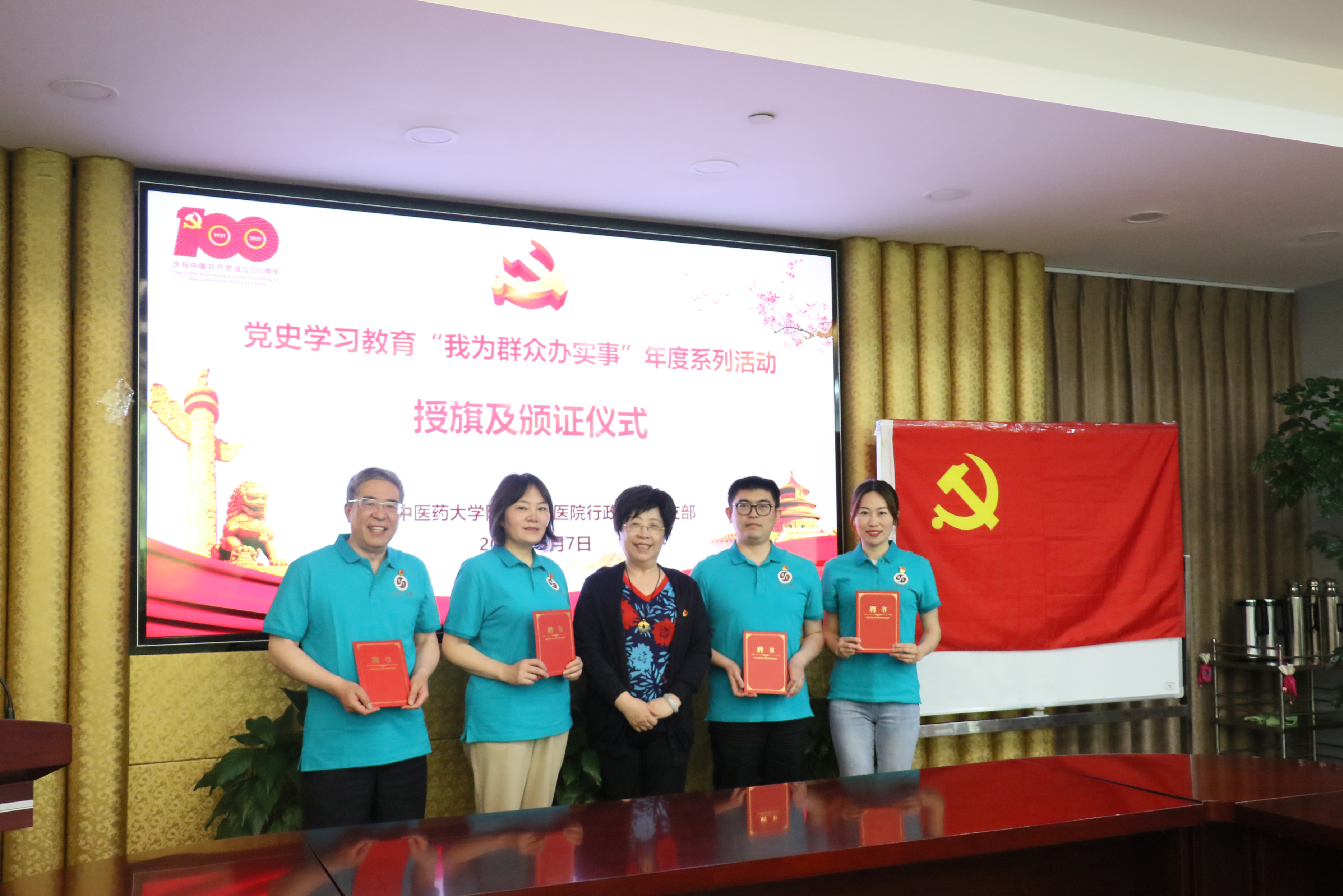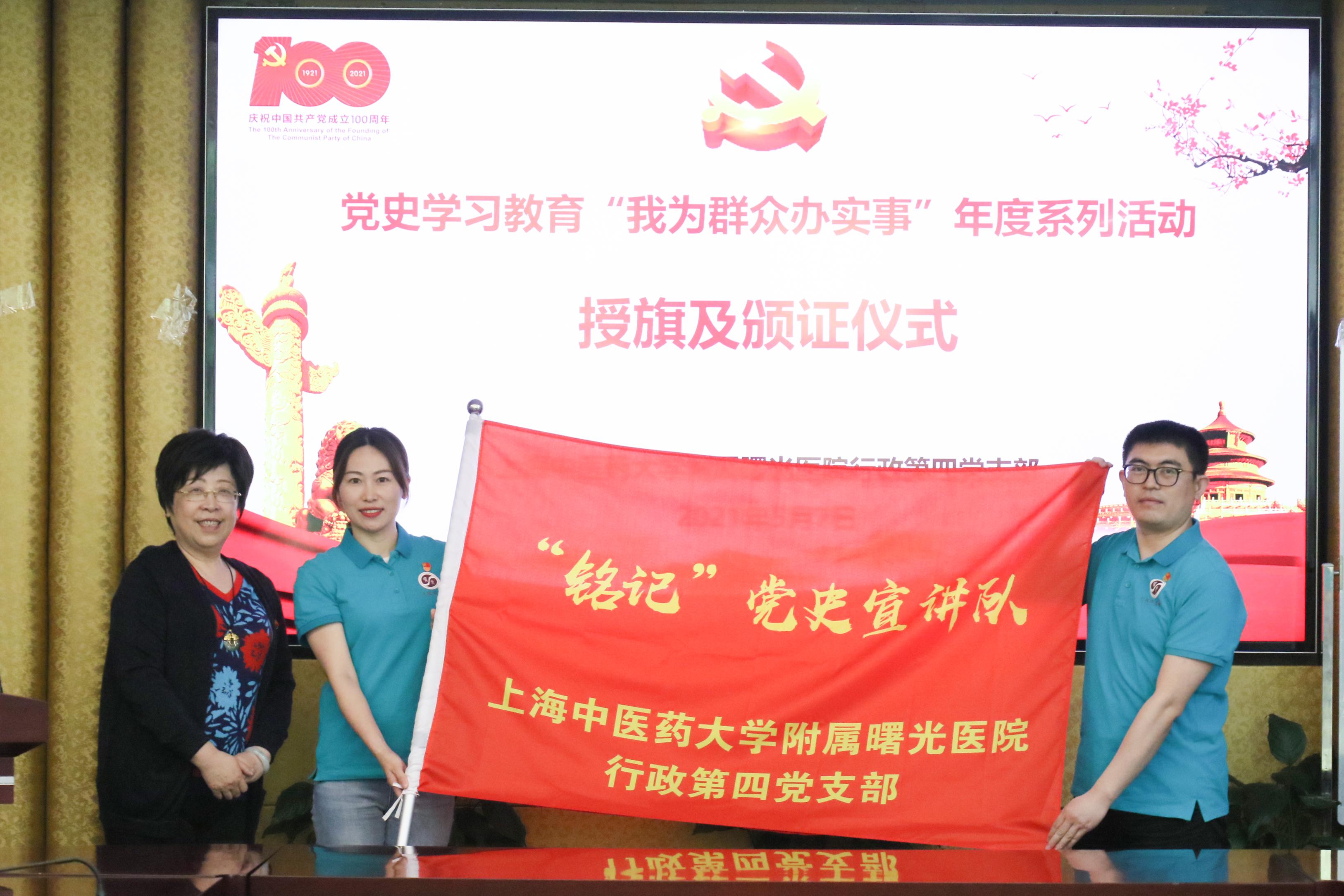 为深入贯彻落实beat365官方网站党委和附属曙光医院党委关于党史学习教育的工作部署,5月7日中午,医院行政第四党支部召开党史学习教育之“我为群众办实事”系列活动授旗及颁证仪式。医院党委书记马俊坚出席。