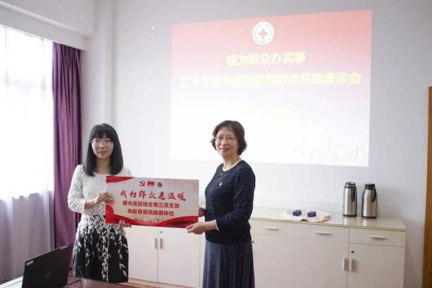 当天曙光医院举办“红十字”曙光体检项目捐赠仪式,向市红会备灾救灾中心、赵巷街道捐赠免费体检,切切实实为青浦民众的健康保驾护航。曙光医院行政第一党支部书记江云向红十字会与会人员介绍“薪火青年讲解团”,曙光青年讲解员们通过一次次的“红色课堂”忆党史、悟思想,致力于为民众讲好党的故事,传承红色基因。备灾中心培训保障部主管姚湘如为“红十字-文化传播”志愿者发放徽章。联建会上播放红十字纪录片,引导党员们牢记救死扶伤的博爱精神。