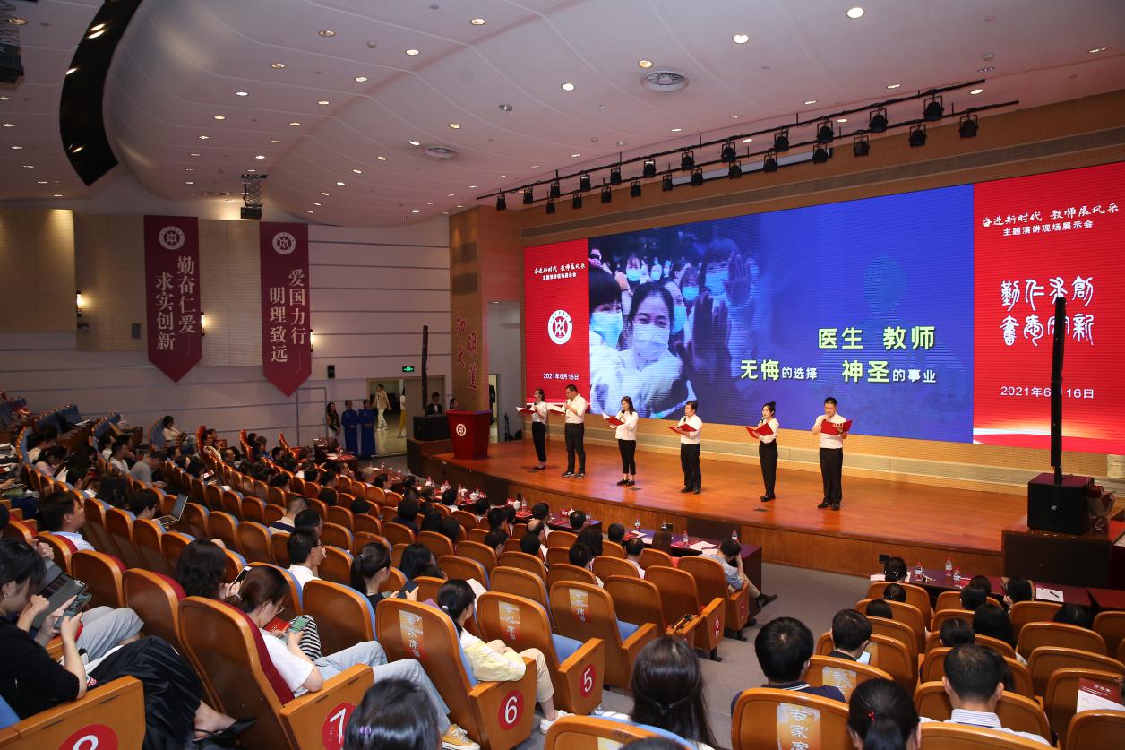 “一个时代有一个时代的主题,一代人有一代人的使命”,由机关党委青年党员教师赵如月原创的作品《走在新时代长征路上的上中医人》歌颂了上中医老一辈名医大家用信仰撑起“教师”二字的责任和使命,将毕生心血奉献给杏林沃土的长征精神,并号召教师们在新时代长征路上永葆初心,为党育人、为国育才,为中医药事业的弘扬发展奋进。《守教育报国初心,担筑梦育人使命》演讲则通过三位分别从事教学、科研和行政工作的青年教师视野,讲述他们在异国他乡开展主题党团日活动、发展中药产业助力脱贫攻坚及两代教师师道传承的故事。一段段承载着爱国情、强国志、报国行的追梦征程,激励着现场师生坚定理想信念,立鸿鹄志、做奋斗者。