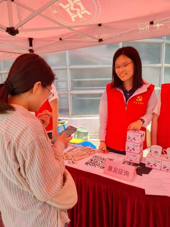 为更好地了解广大毕业生对学校后勤服务工作的感受、评价,充分地听取意见建议,党支部开展后勤服务意见网上征询活动,邀请毕业生通过线上评价方式对食堂餐饮、公寓管理、教室服务、水电维修等各项后勤服务项目进行满意度测评,并为母校建言献策。截止目前,共收到线上反馈答卷50份。在6月24日活动现场,支部还特别设立“意见征询接待点”,通过面对面沟通的方式,党员认真倾听毕业生心声。