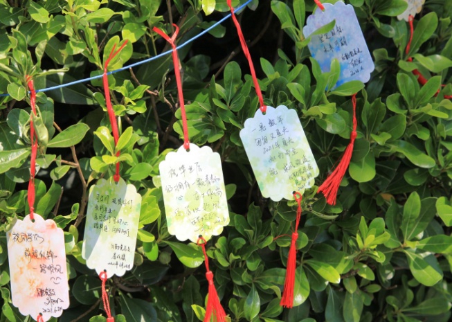 活动现场,在祈福树旁,毕业生们纷纷驻足,认真品读卡片上的谆谆寄语,掏出手机拍照留念,并在祈愿卡上亲笔写下自己的毕业愿望,亲手在树枝上系上自己的美好祝托,许下对未来生活的憧憬和希冀。