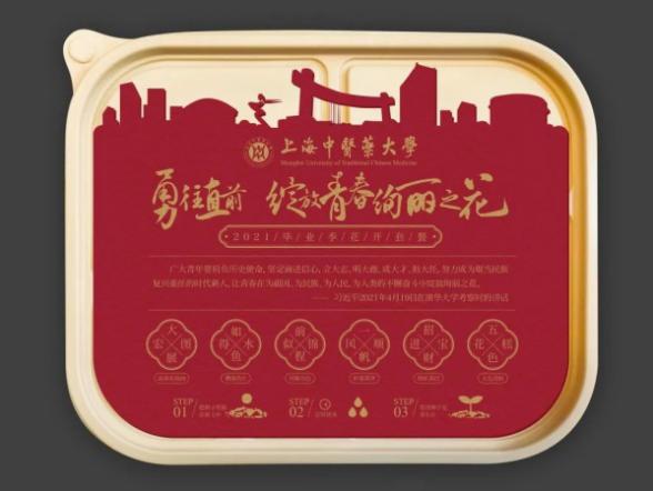 6月25日毕业典礼当天,学生食堂为毕业生们精心准备“2021年毕业季花开套餐”,每一份餐食都融入了后勤服务人员对毕业学子的满满深情。红色盒贴上写着“勇往直前,绽放青春绚丽花”,这13个字的主题引自于习近平总书记于今年4月29日在清华大学考察时对青年的寄语——“广大青年要肩负历史使命,坚定前进信心,立大志、明大德、成大才、担大任,让青春在不懈奋斗中绽放绚丽之花!”