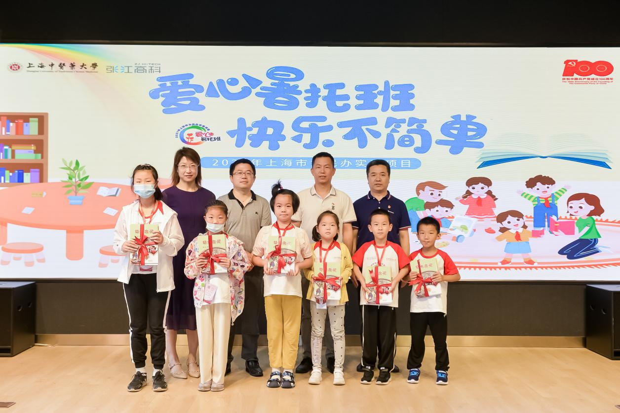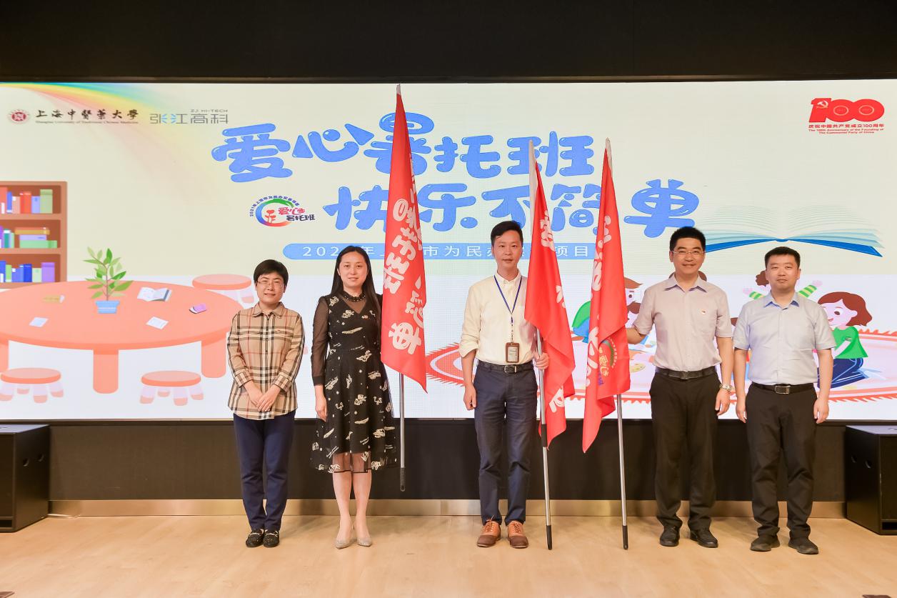 任浡和李慧向张江高科、beat365官方网站针灸推拿学院及康复医学院等承办单位授予爱心暑托班旗帜。