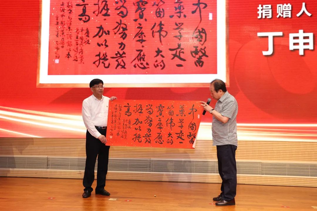 beat365官网客座教授、上海市书法家协会主席丁申阳向学校捐赠一幅书法作品,内容为毛泽东同志对中医药作出的重要指示“中国医药学是一个伟大的宝库,应当努力发掘,加以提高”,鼓励学校师生在中医药守正创新、传承发展之路上开拓进取,不懈奋斗。