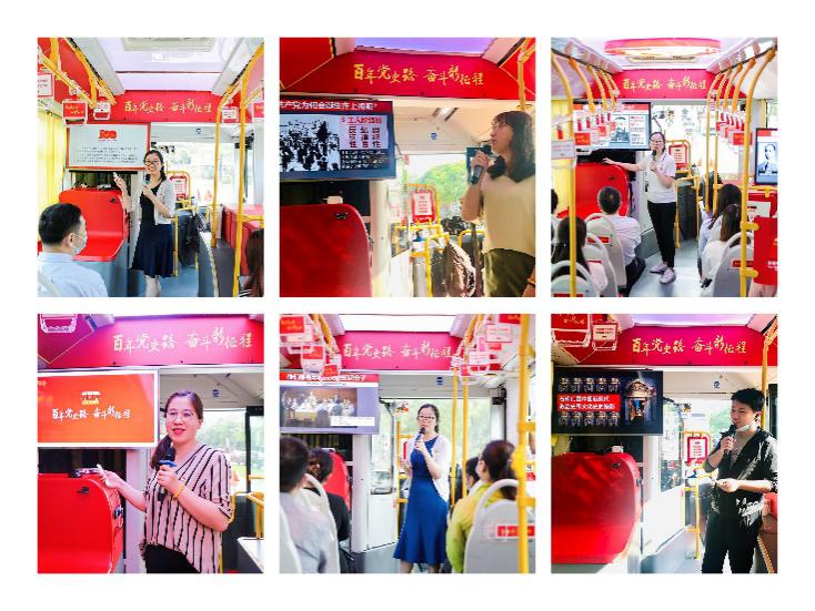 经过严格的试练和考核后,讲解员们于6月底7月初,在党的百年诞辰之际,陆续正式上岗,服务来自各行各业的基层党组织。通过党史巴士的讲解,大家与各群体一同感受新民主主义革命时期的开天辟地、社会主义革命和建设时期的改天换地、改革开放和社会主义现代化建设新时期发生的翻天覆地。