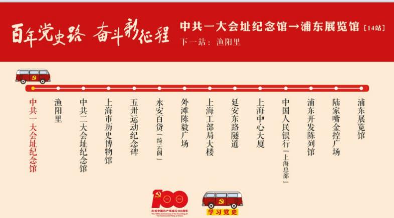 在上海市委宣传部的指导下,浦东新区区委宣传部联合中共一大会址纪念馆、SMG推出了全新的党史学习教育巴士课堂(以下简称党史巴士)。这趟巴士从党的诞生地——中共一大会址纪念馆出发,途径渔阳里、中共二大会址纪念馆、五卅运动纪念碑、外滩陈毅广场、浦东开发陈列馆等20多处红色地标。围绕“百年党史在上海的精彩演绎”这一主线,党史巴士把上海珍贵的红色资源串点成线,将历史故事和现实场景相结合,打造出一堂跨越浦江两岸、贯穿百年历史的精品党课。