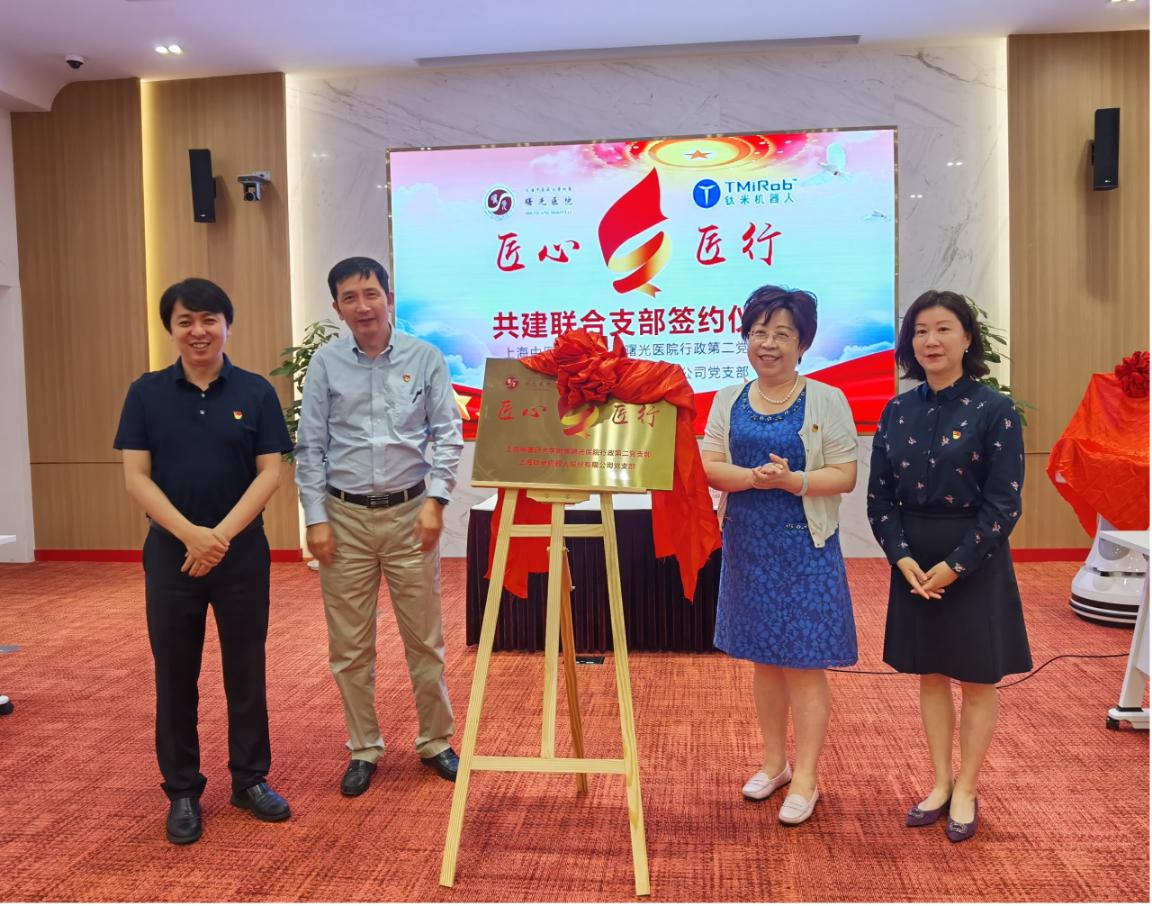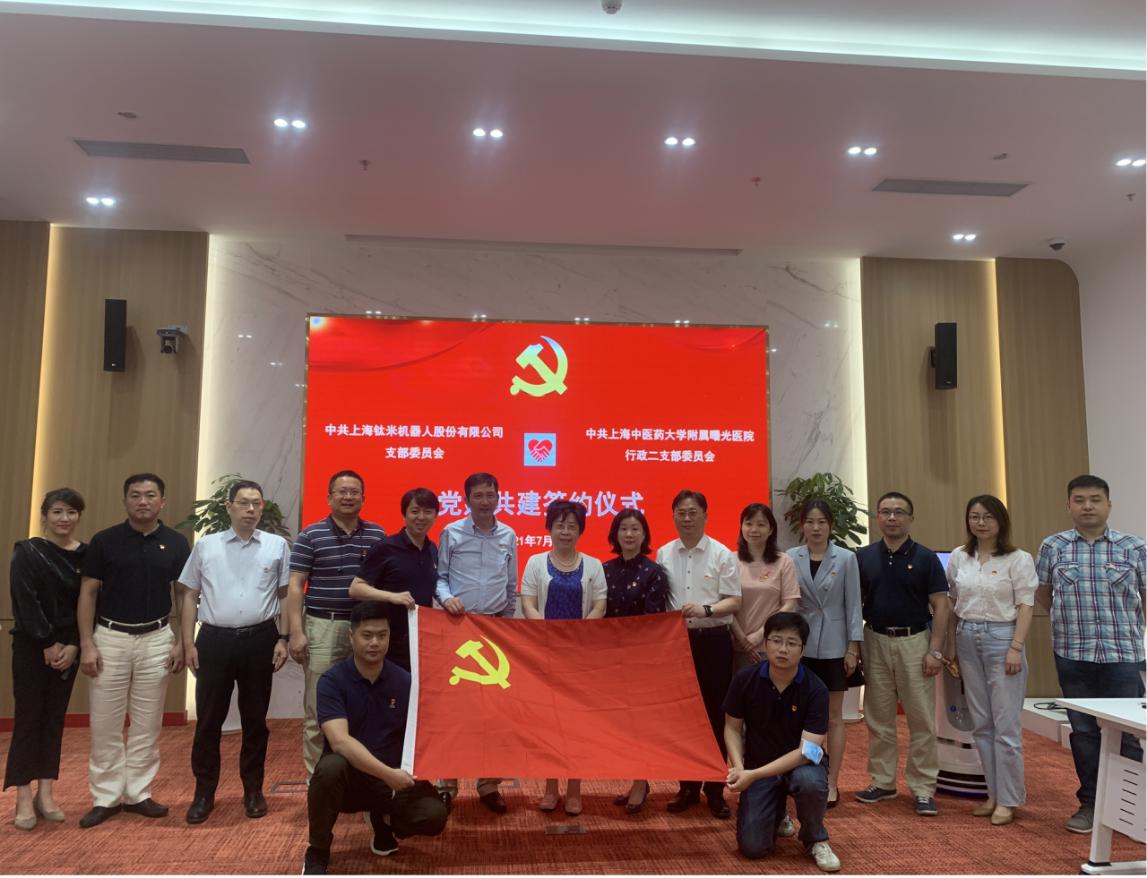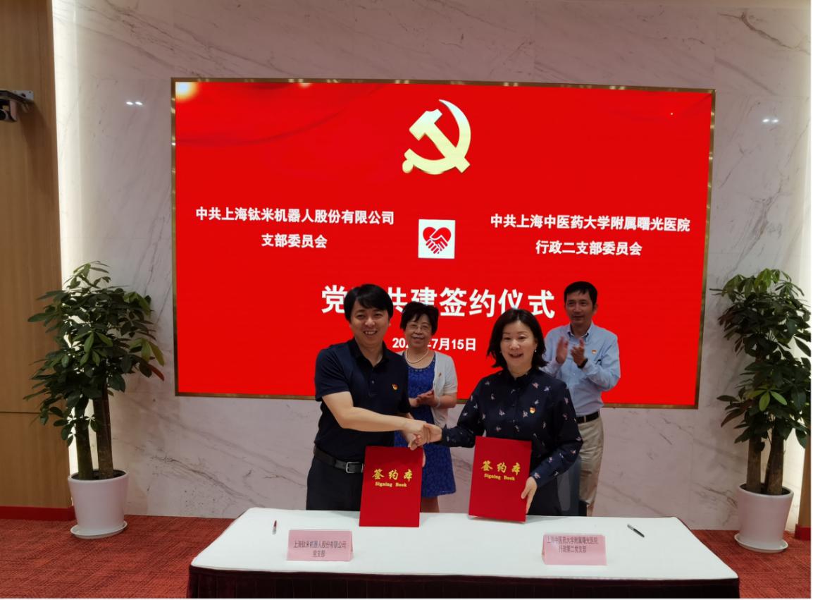 为深入学习贯彻习近平新时代中国特色社会主义思想,推进党史学习教育走深走实,进一步创新党建新模式、拓展党建新联盟,7月15日上午,beat365官网附属曙光医院行政第二党支部与钛米机器人股份有限公司党支部在张江科学城党建服务中心开展党建签约仪式。曙光医院党委书记马俊坚,张江科学城综合党委专职副书记陆勤,曙光医院党委委员、副院长竺炯,上海钛米机器人股份有限公司党支部书记、董事长潘晶,曙光医院组织统战部部长练慧、行政第二党支部书记谢晓蓉及部分共建单位代表出席仪式。