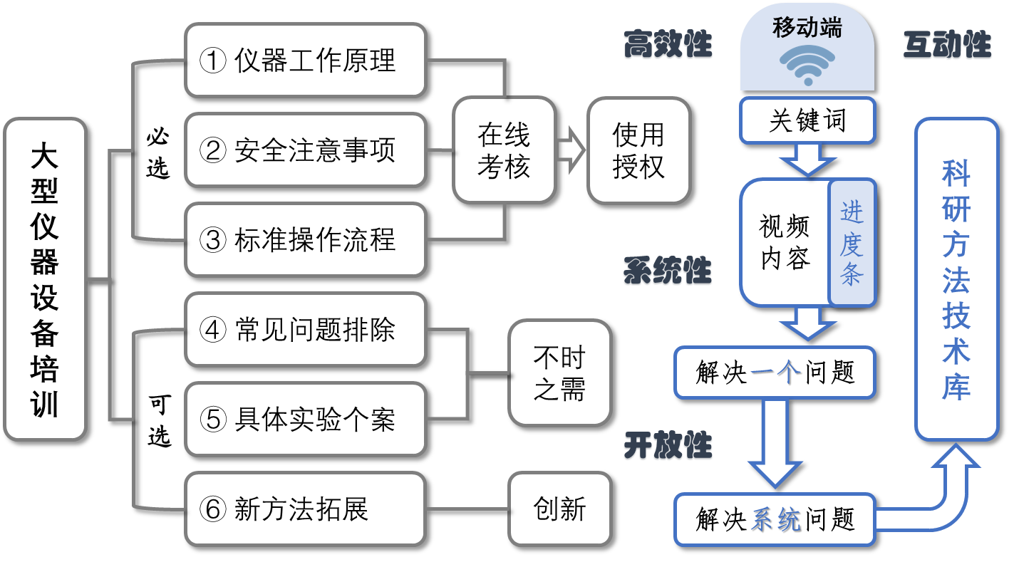 该体系从基础培训到进阶应用,覆盖权限授予、标准操作流程、常见问题排除等多方面培训功能。与知识传授的“慕课”不同,实验技术培训的目的在于实现技术的实际操作,通过视频演示更直观传递实验技术信息。结合已相当普及的无线网络条件和视频平台技术,实现了更高效的大型仪器技术培训。视频培训系统运行以来,获得了广大师生的欢迎与认可,目前视频播放量已达7000余次。通过在线互动,也能实现实时的技术答疑与学术交流。由此,相关大型仪器设备的使用效率与使用质量都有所提高。专职技术人员通过培训视频的系统构建,也进一步提升了自身的技术水平。同时,更规范的设备使用与仪器操作也大幅降低了设备故障的发生。高效的培训模式提供了实验技术人员更进一步自我提升的可能性,而团队整体水平的提升则构成了公共技术服务平台内涵建设的核心。(科技实验中心)