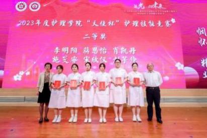 与会嘉宾为获得2023年护理学院“天使杯”护理技能大赛和beat365官方网站第一届护理创新大赛获奖师生颁奖。