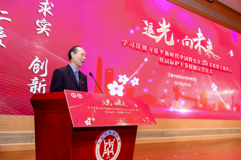 护理学院党总支书记史美育在致辞中代表学院党政领导班子向支持关心学院发展的学校领导、职能部门、各兄弟单位及临床实践教学基地的护理同仁们表达深切敬意和感谢,并鼓励同学们在新时代新征程中,秉持爱心、细心、耐心和责任心走入临床、走近患者,满怀信心,踔厉奋发,为护理事业的发展前进不懈奋斗。