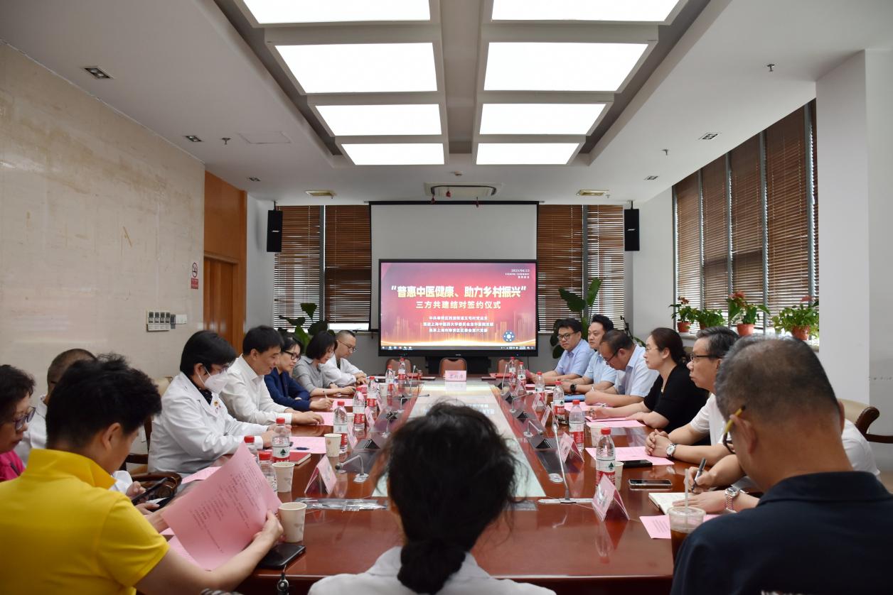 为深入开展学习贯彻习近平新时代中国特色社会主义思想主题教育,助力乡村振兴,近日,中共上海市奉贤区西渡街道五宅村党总支、民进beat365官方网站委员会龙华医院支部、民革上海市奉贤区委会第六支部在龙华医院举行“普惠中医健康、助力乡村振兴”三方共建结对签约仪式。奉贤区西渡街道党工委副书记黄蕾,民进中医大委员会副主委傅勤慧,龙华医院副院长郑培永,民进龙华医院支部主委缪婵,奉贤区政协农业农村委副主任、民革奉贤区委委员蔡月弟与三方部分党员、会员代表参加共建签约仪式。